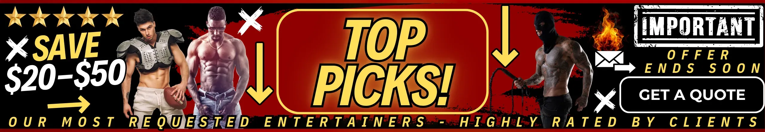 Discover our most popular entertainment choices—from high-energy male strip shows to buff butler service, shirtless bartenders, party bus performers, and so much more—all available at special discounted rates.