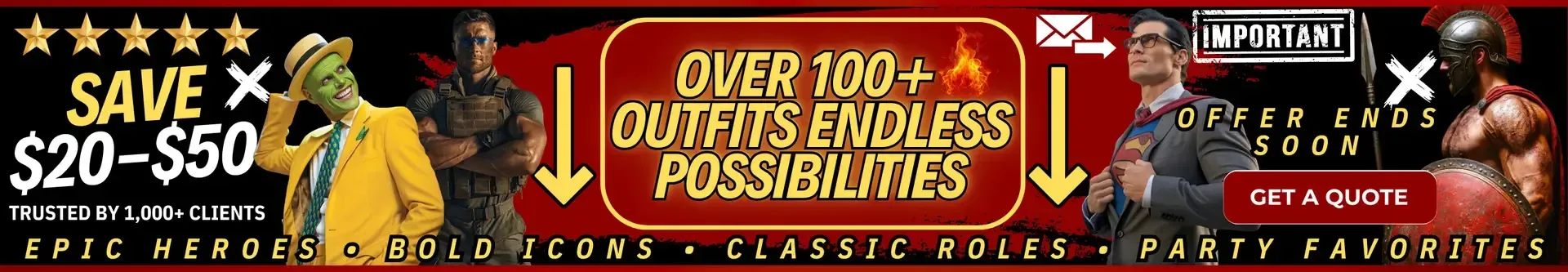 Choose from over 100 outfits—firefighters, police officers, doctors, cowboys, seductive nurses, CEOs, military, construction workers, mariachi, pizza boy, UPS, lawyer, and more.